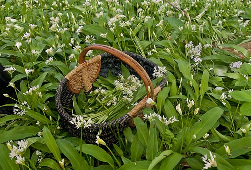 Wilder Bärlauch während der Blütezeit in einen Korb gesammelt