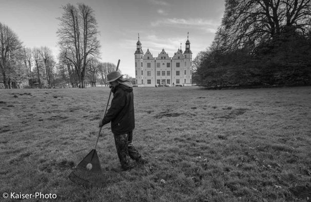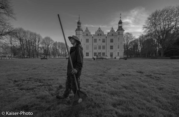 Darf ich ein Foto von dir mit der Laubharke machen? Fragte ich. „Ja, gerne vielleicht dort drüben.“ Sagte Maik und zeigte mit der behandschuhten Hand zu dem sanften Hügel hinüber, gleich hinter der Buche mit dem merkwürdigen Wuchs, die ein Naturdenkmal ist. Schnell verschwindet jetzt Mitte November die Sonne am Nachmittag und im Westen des Geländes stehen die höchsten Bäume auf der hohen Kante. Es mußte alles schnell gehen, denn ich hatte weder Blitz noch Stativ zur Hand. Dank Maiks spontaner Bereitschaft mit zumachen sind diese Inszenierten Fotos entstanden. Meine Idee war in Anlehnung an alte Französische Meister, Mensch und Schloss in Beziehung zu setzen.