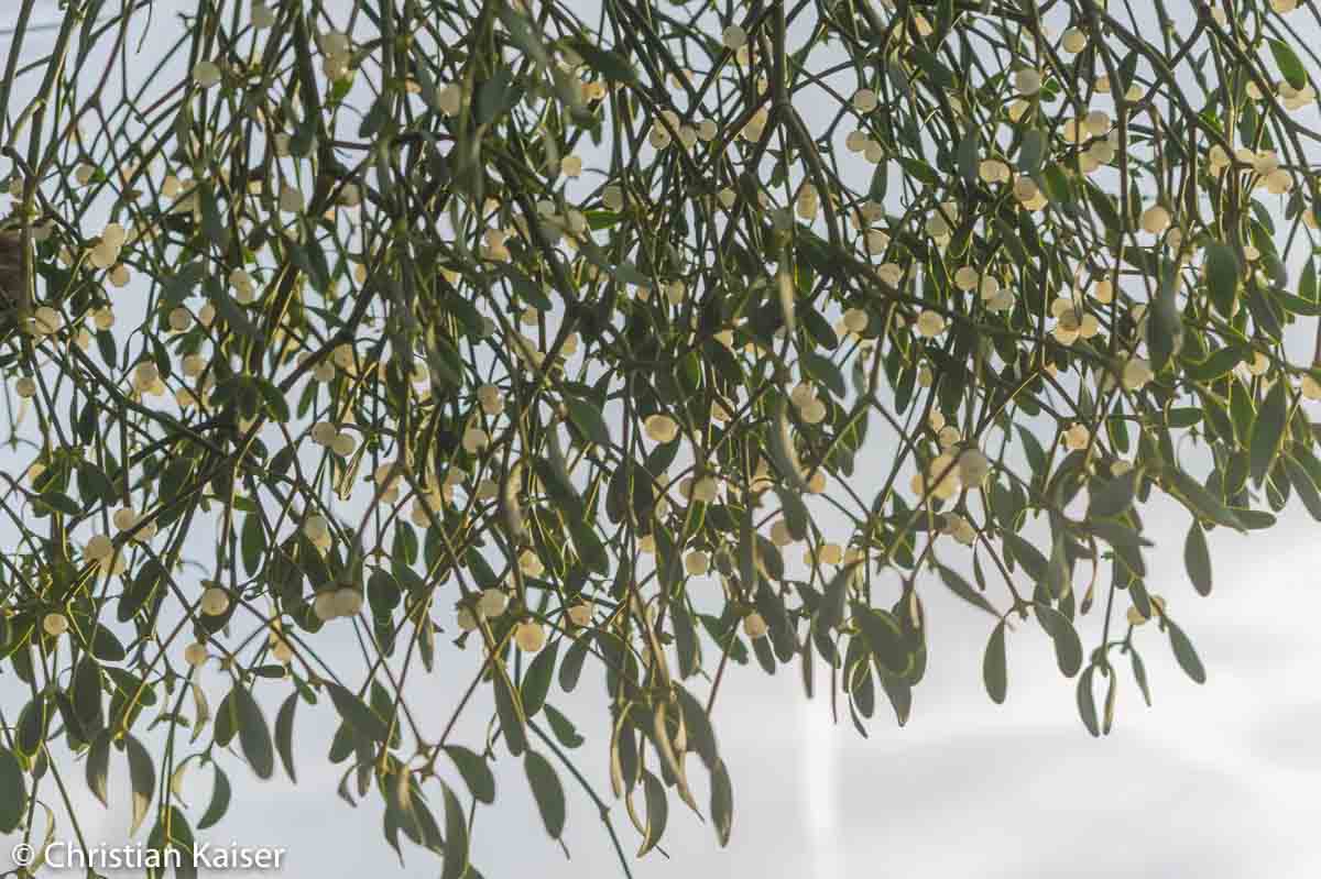 Besonders im Winter fallen uns an den kahlen Ästen bestimmter Bäume kugelige, gelblich-grüne Büsche mit einem Durchmesser von bis zu einem Meter auf – die Weißbeerige Mistel.