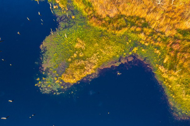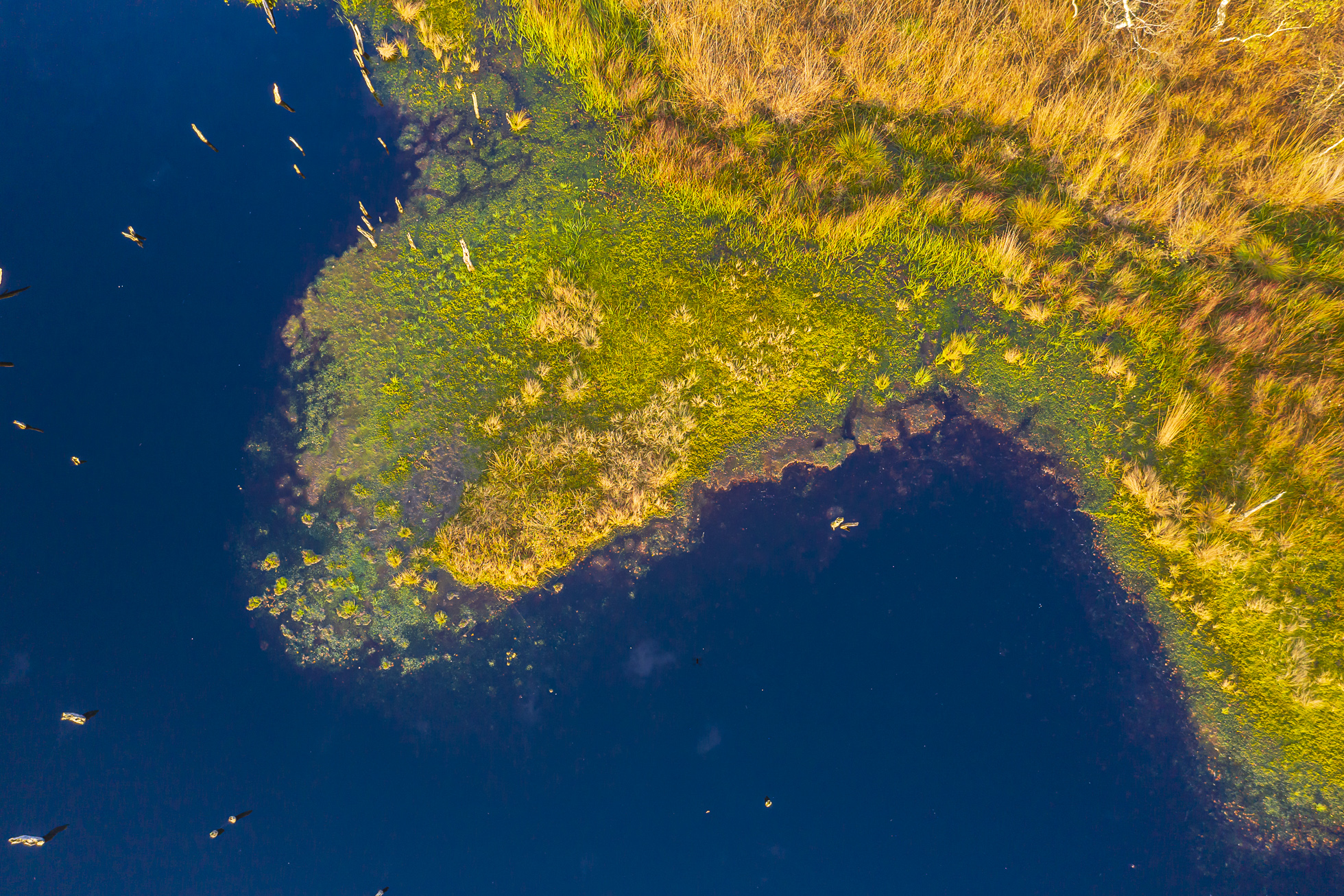 Torfmoos bildet hier eine Halbinsel im Teich. Seggen wachsen auf dem Torfmoos (Sphacnum)