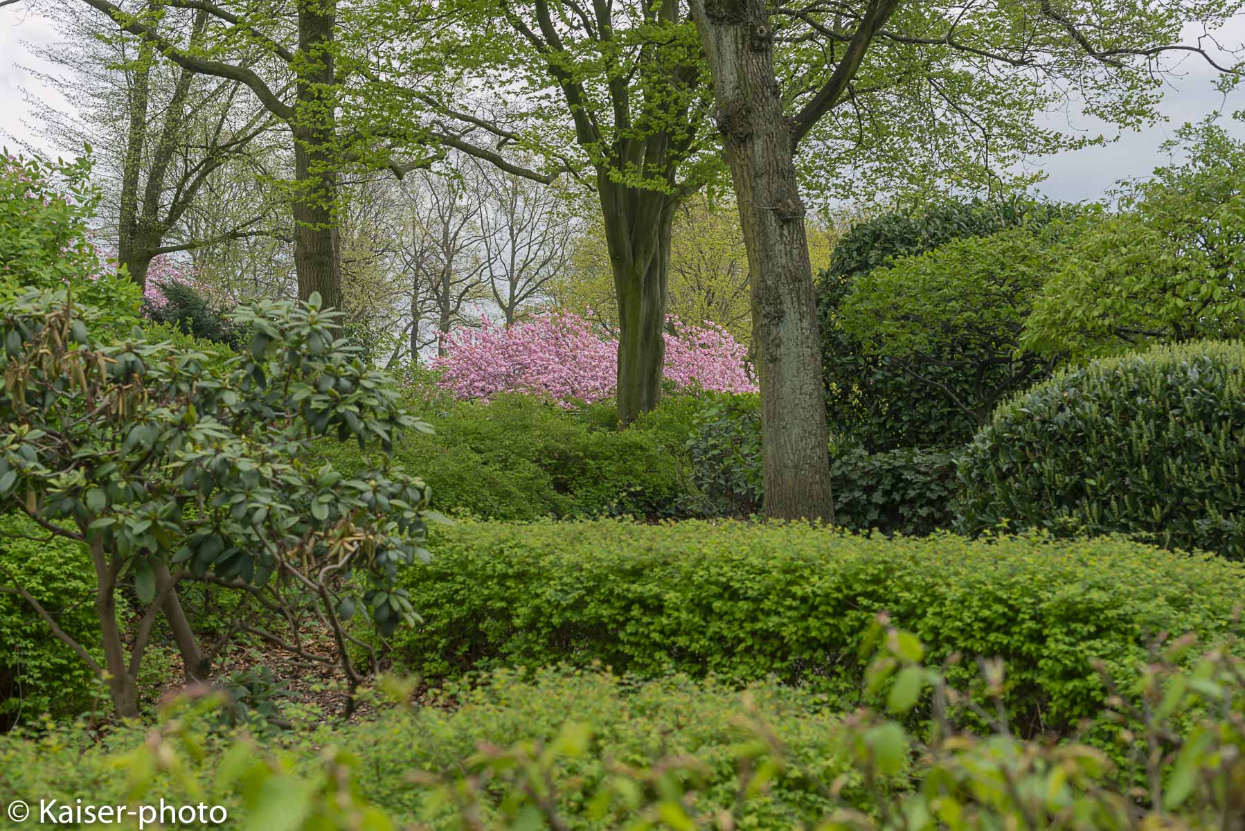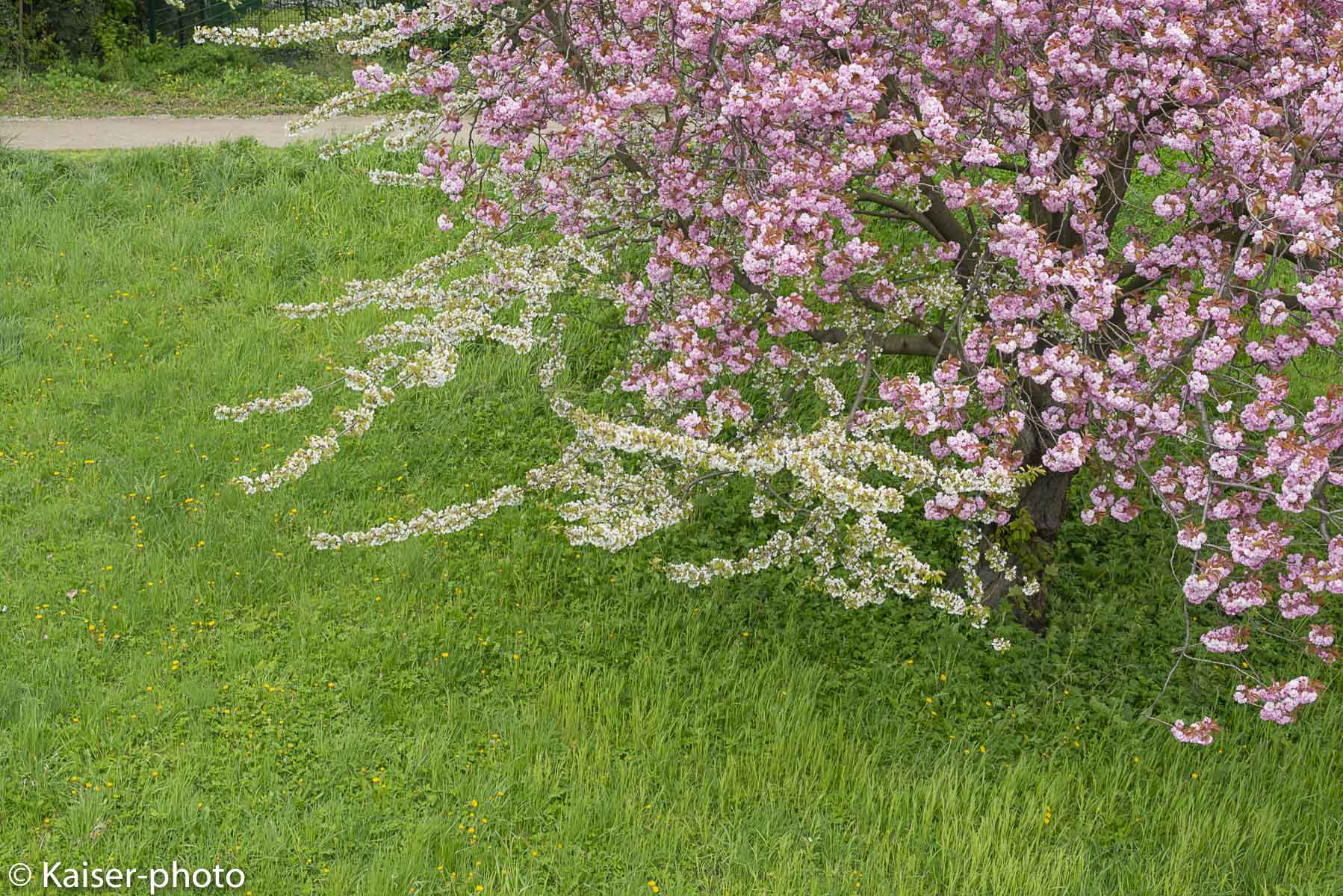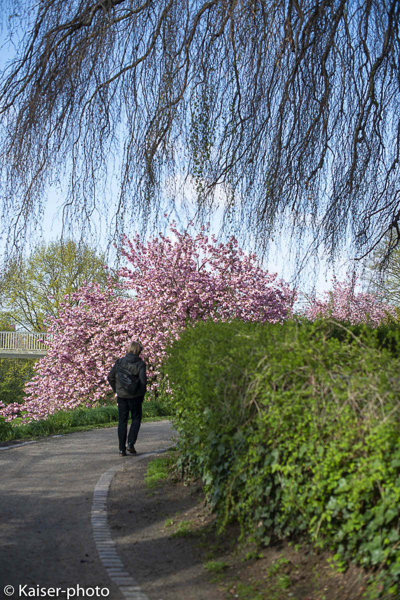 Hier handelt sich um die rosa blühende Zierkirsche, in der Fachsprache auch Accolade im Volksmund oft auch als Mandelbaum bezeichnet. Die in der Natur eher seltene Farbe kann durchaus als „Pink“ bezeichnet werden. Der Stadtteil Ottensen zwischen Elbe und Altonaer Bahnhof gelegen, hat einige Prachtexemplare direkt am Elbe-Höhen Wanderweg aufzuweisen. Die Blutbuchen zeigen jetzt ebenfalls ihr rotes Laub.