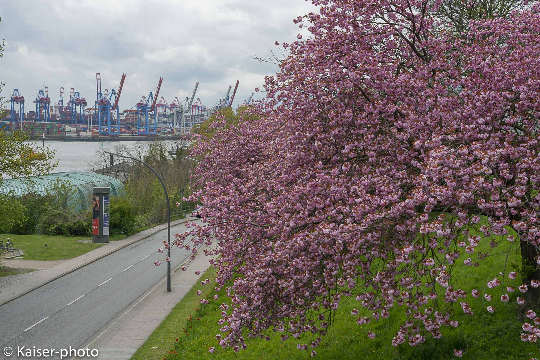 Japanische Zierkirsche an der Kaistrasse in voller Blüte, im Hintergrund die Elbe und der Containerterminal der HHLA im Hamburger Hafen