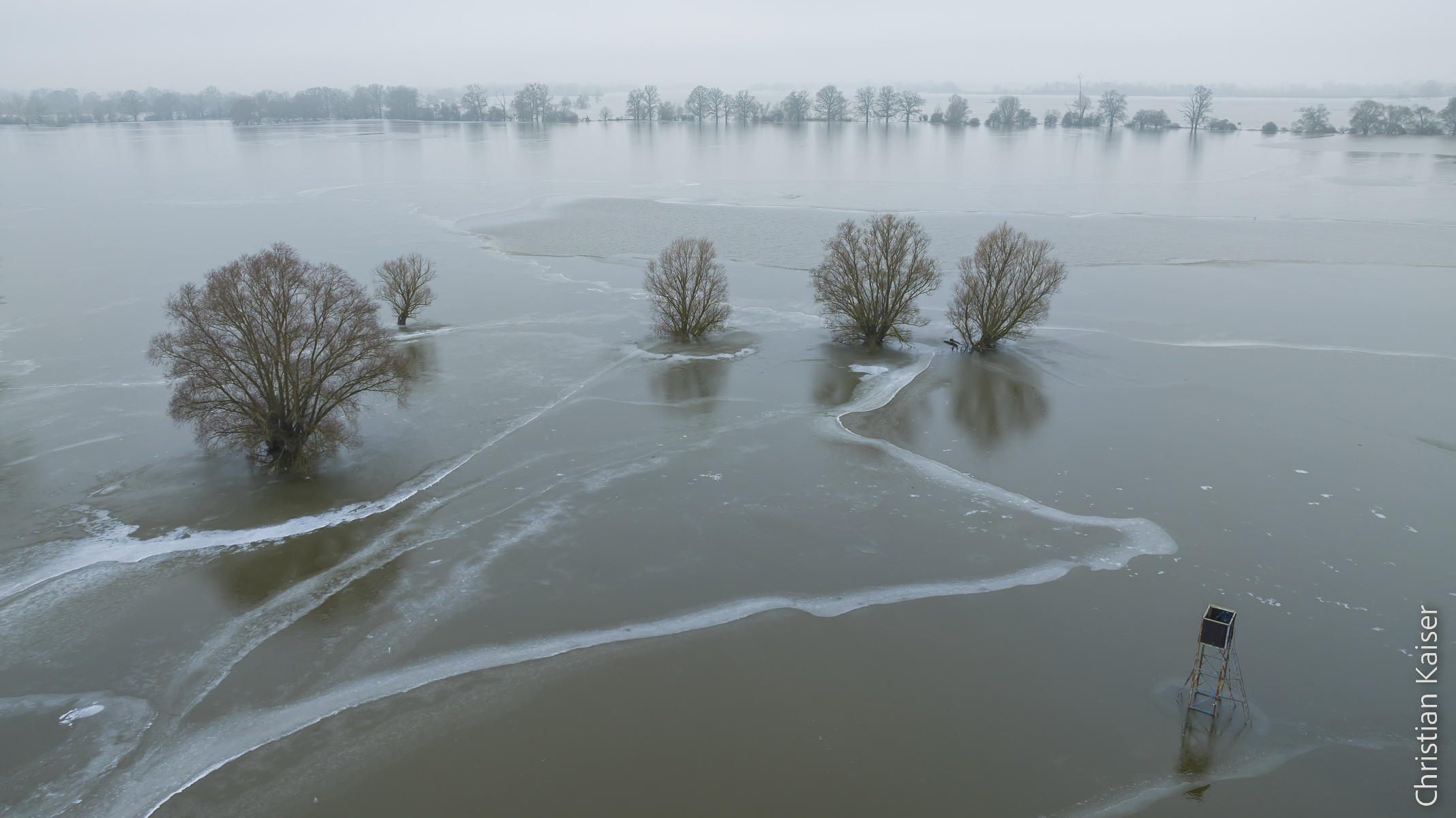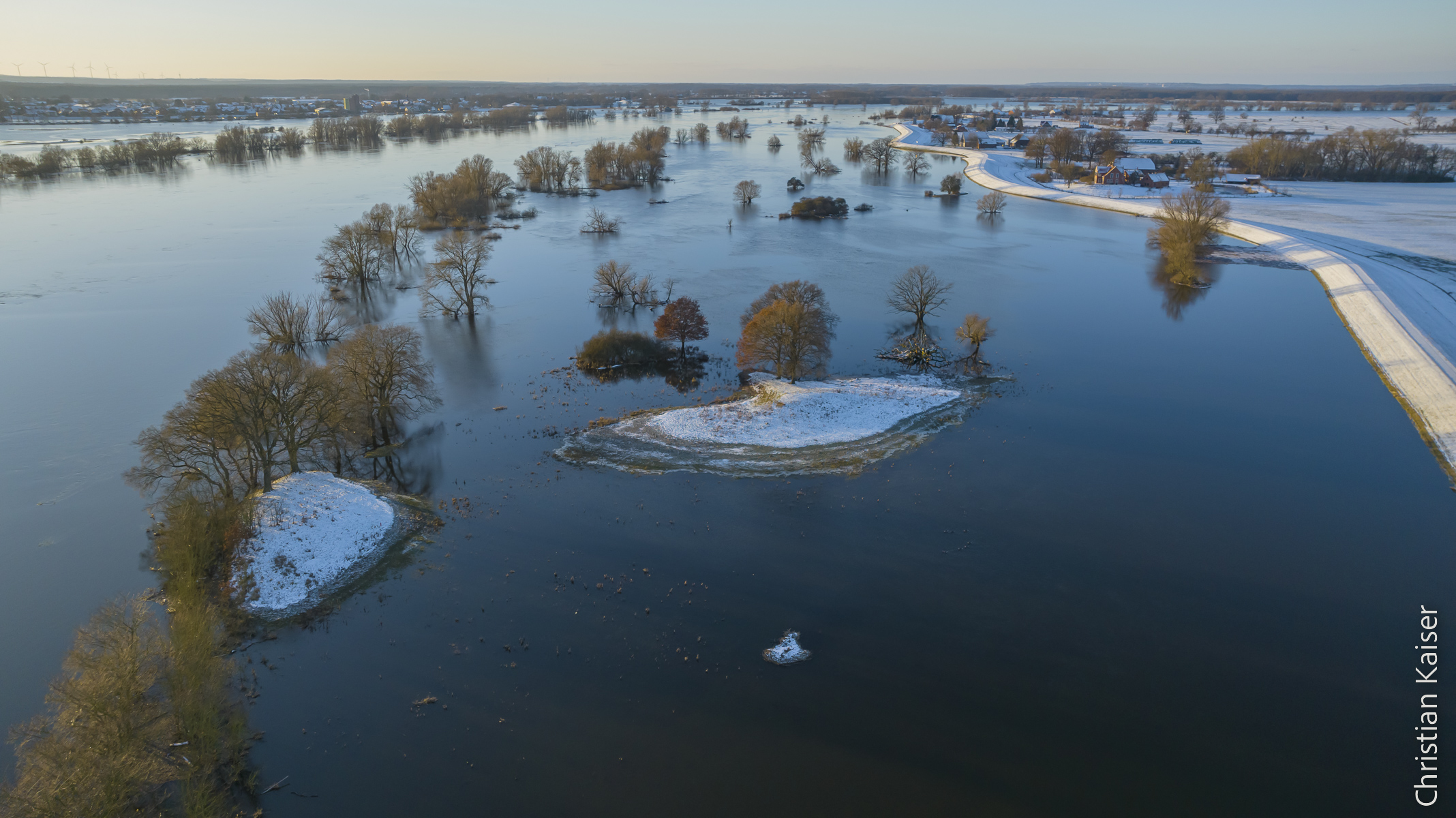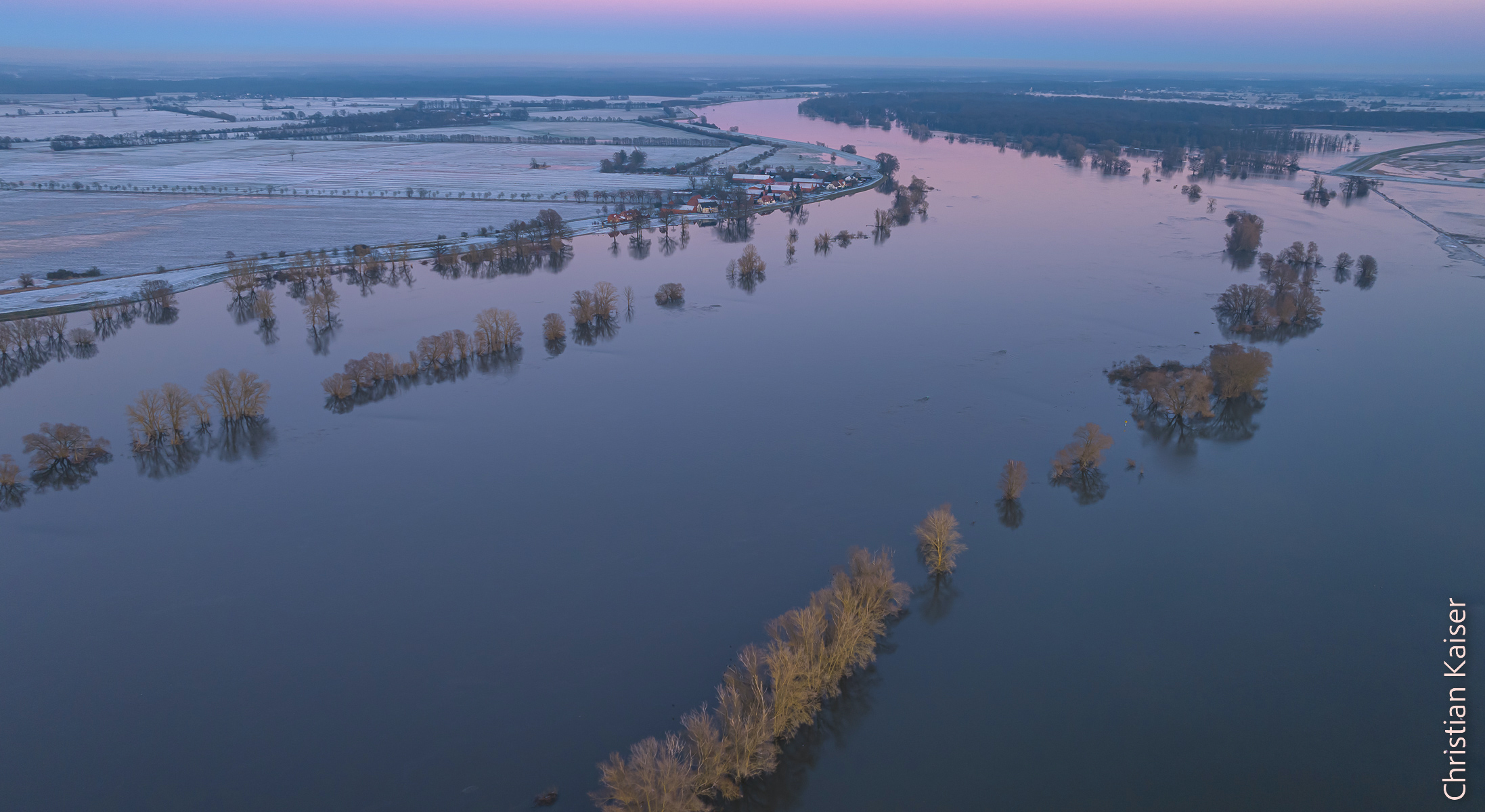 Die Bilder dieser Fotoserie entstanden in der Elbtalaue zwischen der Altmark und Boizenburg, sie zeigen das Winterhochwasser an der Elbe und die überfluteten Elbauen im Januar 2024. Zu dieser Zeit war es winterlich kalt, aber zuvor hatte es in Thüringen und Niedersachsen ungewöhnlich viel geregnet. Wieder ein Beweis der These, der milden feuchten WInter, die uns die Klimakrise beschert. Auf diese Wetterbedingungen in der mir vertrauten Elbaue hatte ich lange gewartet. So entstand meine Fotoserie „Blick aufs Grüne Band“ der Elbe, auch wenn es zugleich ein Blaues Band ist, verwende ich gerne den Begriff Grünes Band.