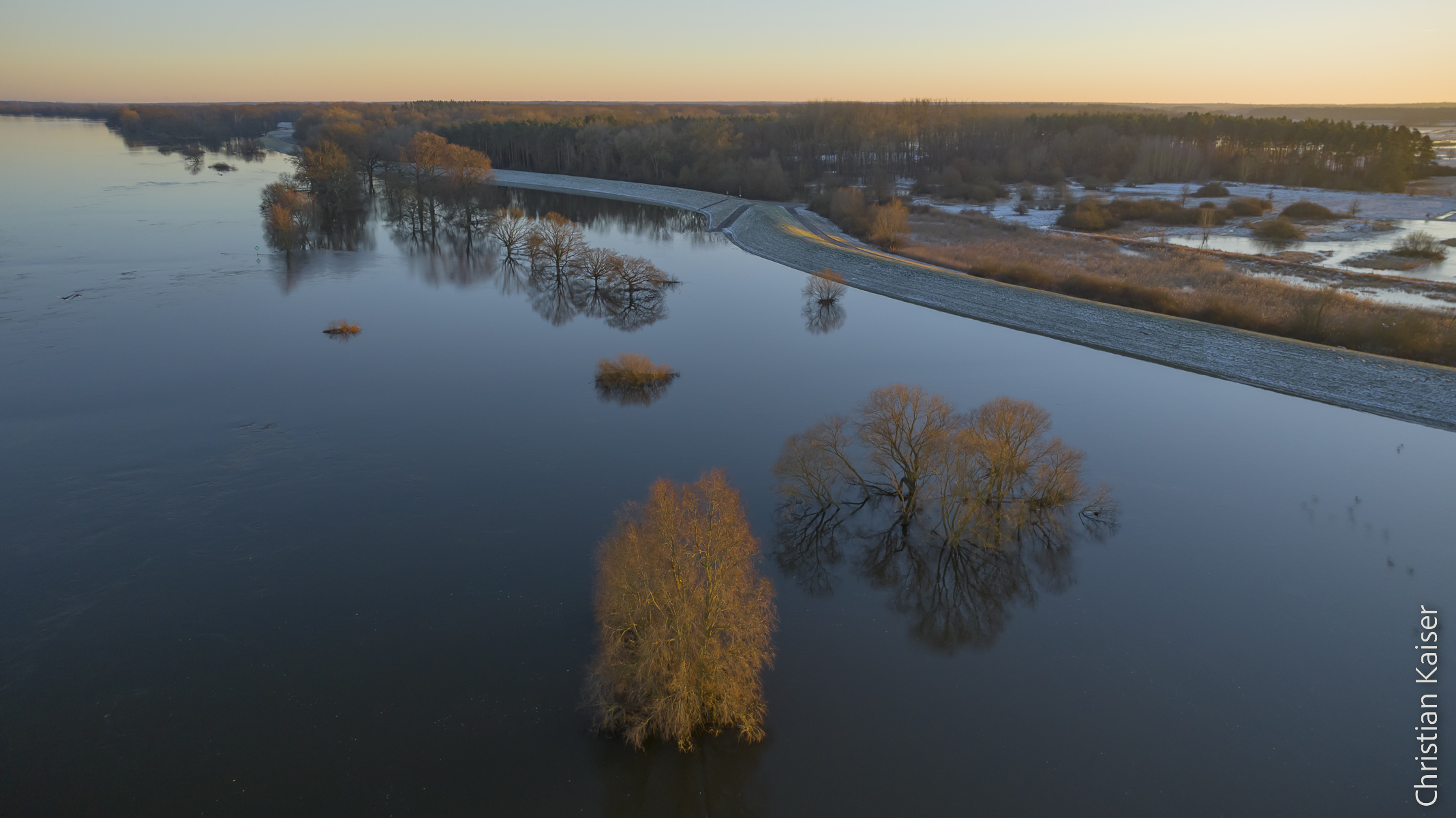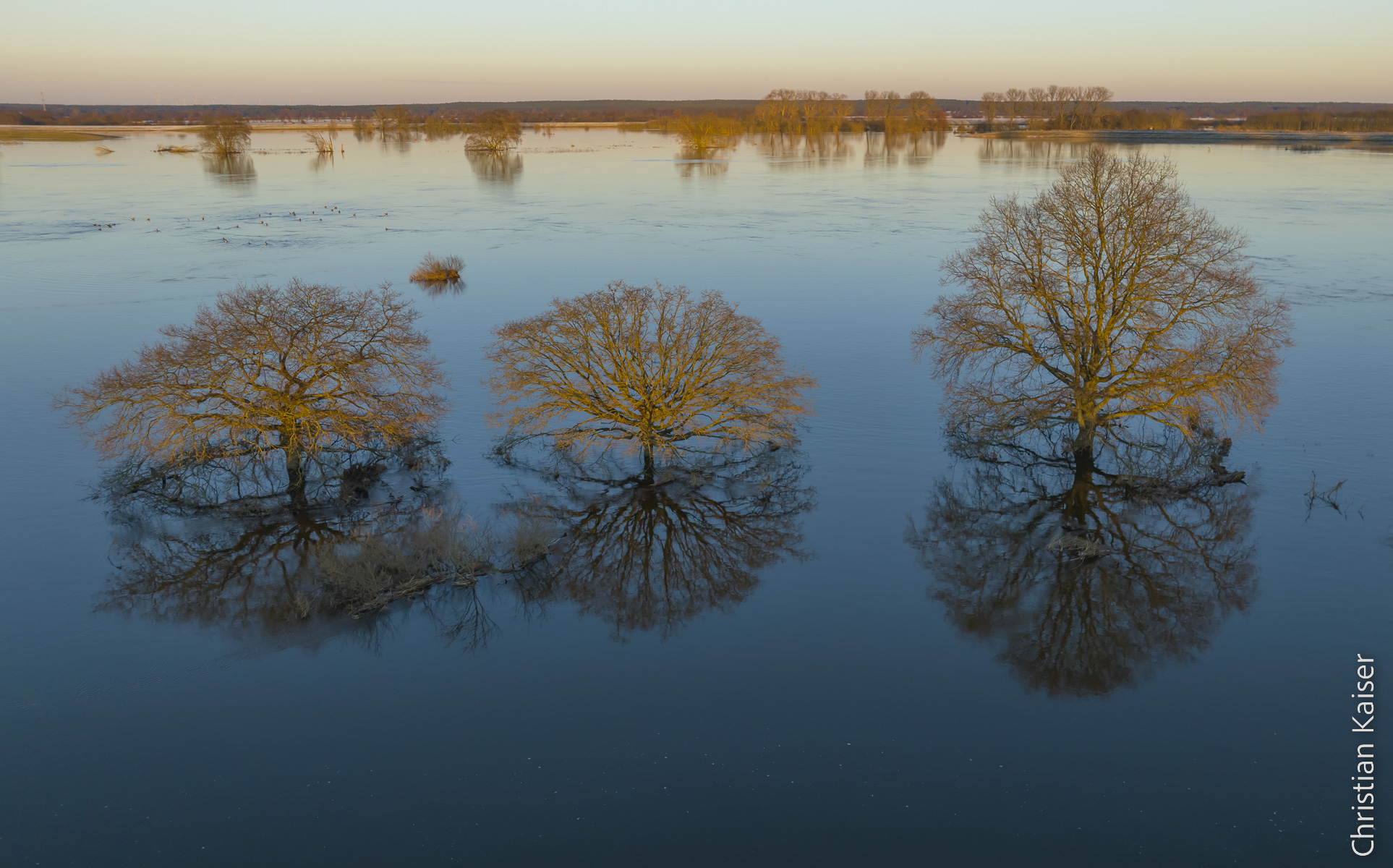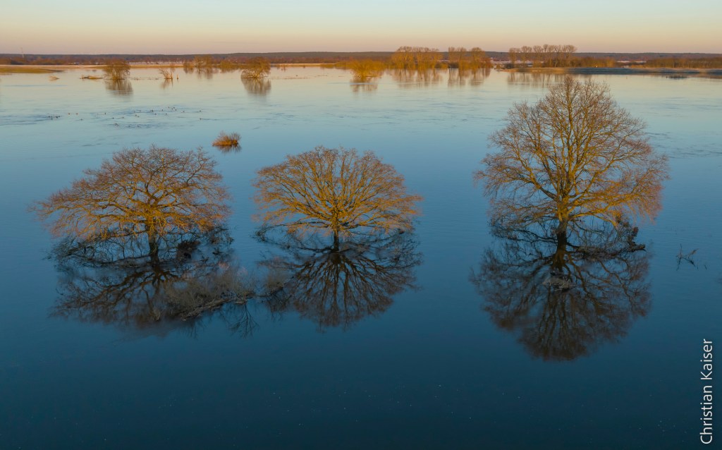Drei Eichen spiegeln sich im Wasser – Blick auf die Elbe bei Winterhochwasser, Teil des Grünen Bands