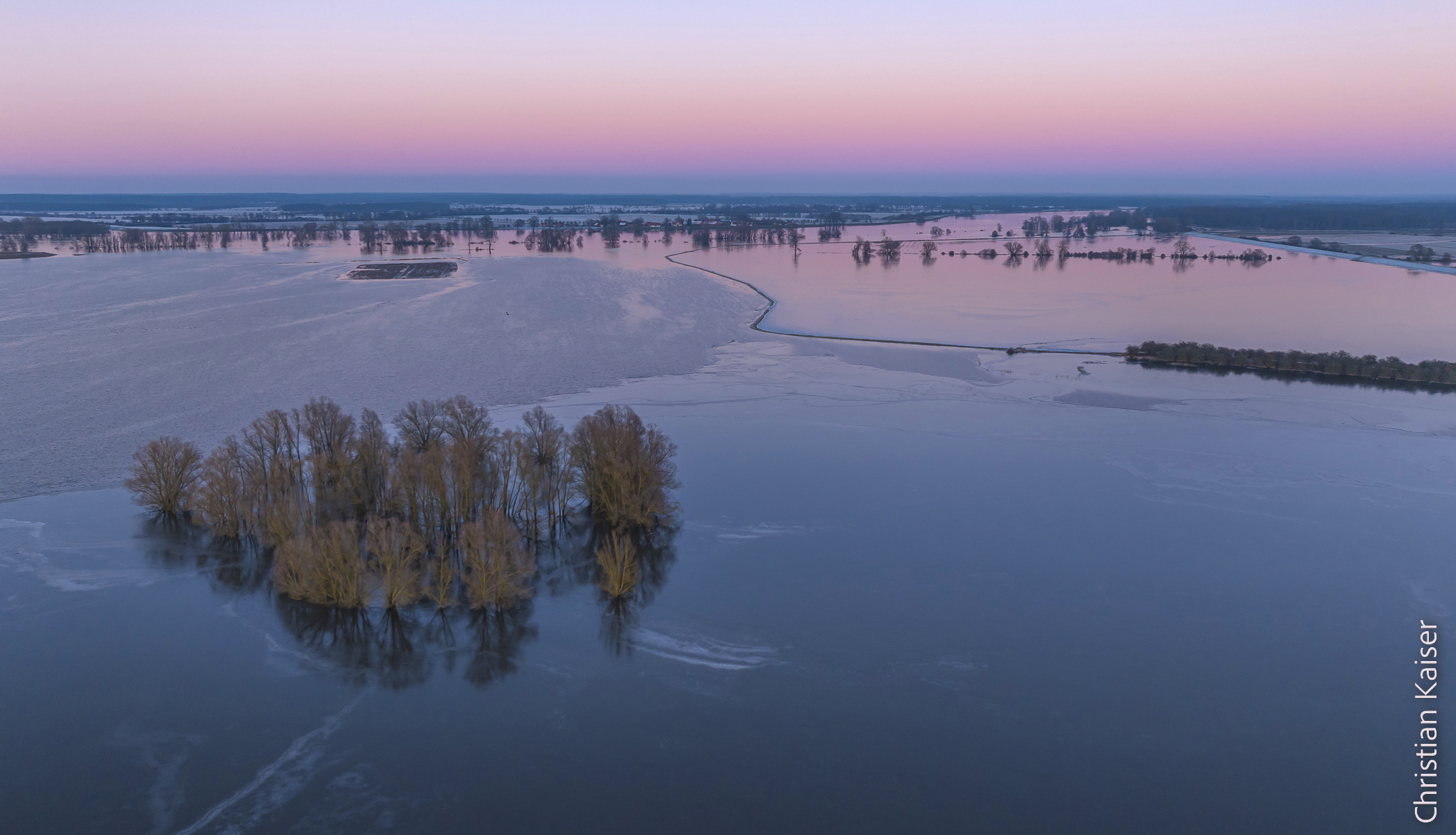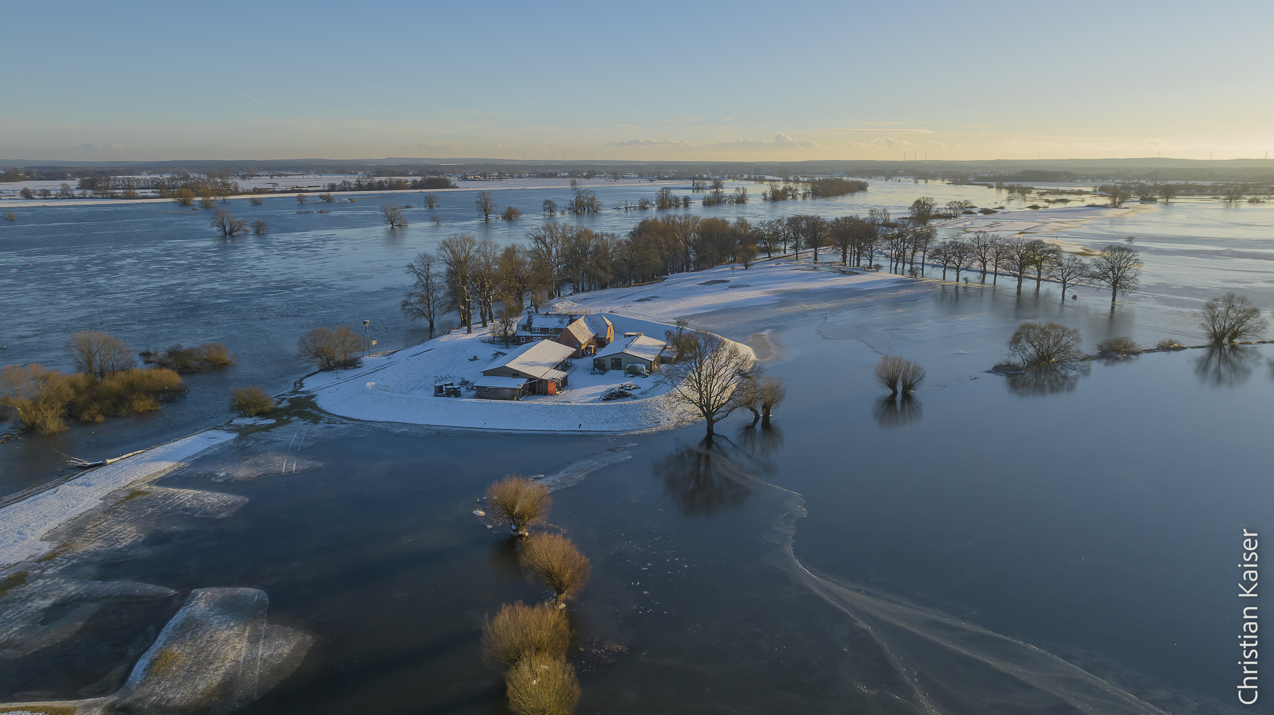 Das gefrorene Winterhochwasser überflutet die Elbtalaue – hier bei Bleckede wo nur der Heisterbusch trocken blieb